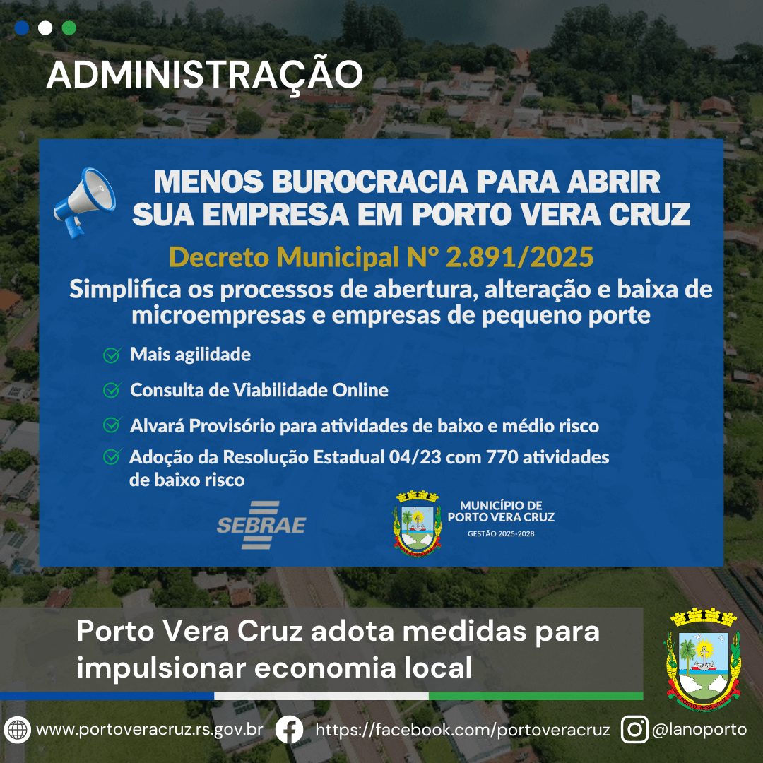 O Município de Porto Vera Cruz publicou, no dia 08 de agosto, o Decreto Municipal nº 2.891/2025, que regulamenta um novo modelo de tratamento diferenciado, simplificado e favorecido para microempresas (ME) e empresas de pequeno porte (EPP). A medida, traz mais agilidade e menos burocracia para empreendedores locais, permitindo que diversos procedimentos sejam realizados de forma online e com prazos reduzidos. O objetivo é incentivar a economia local, apoiar o pequeno empreendedor e criar um ambiente mais favorável para a geração de empregos e renda.