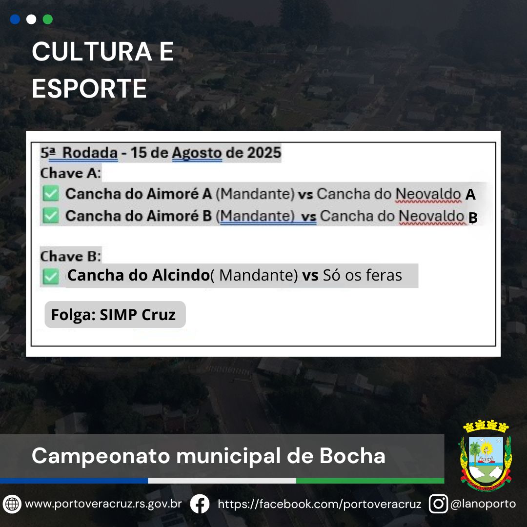 Será realizada na sexta dia 15/08/25, a 5ª rodada do campeonato municipal de bocha. Confira a próxima rodada e a tabela de classificação