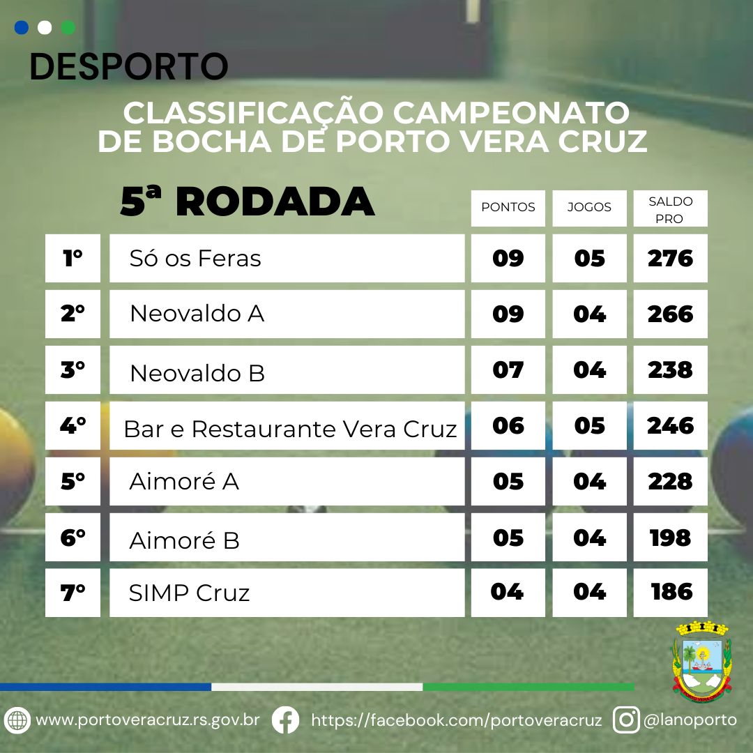 Após encerrada a 5ª rodada do campeonato municipal de bocha. Confira a tabela de classificação.