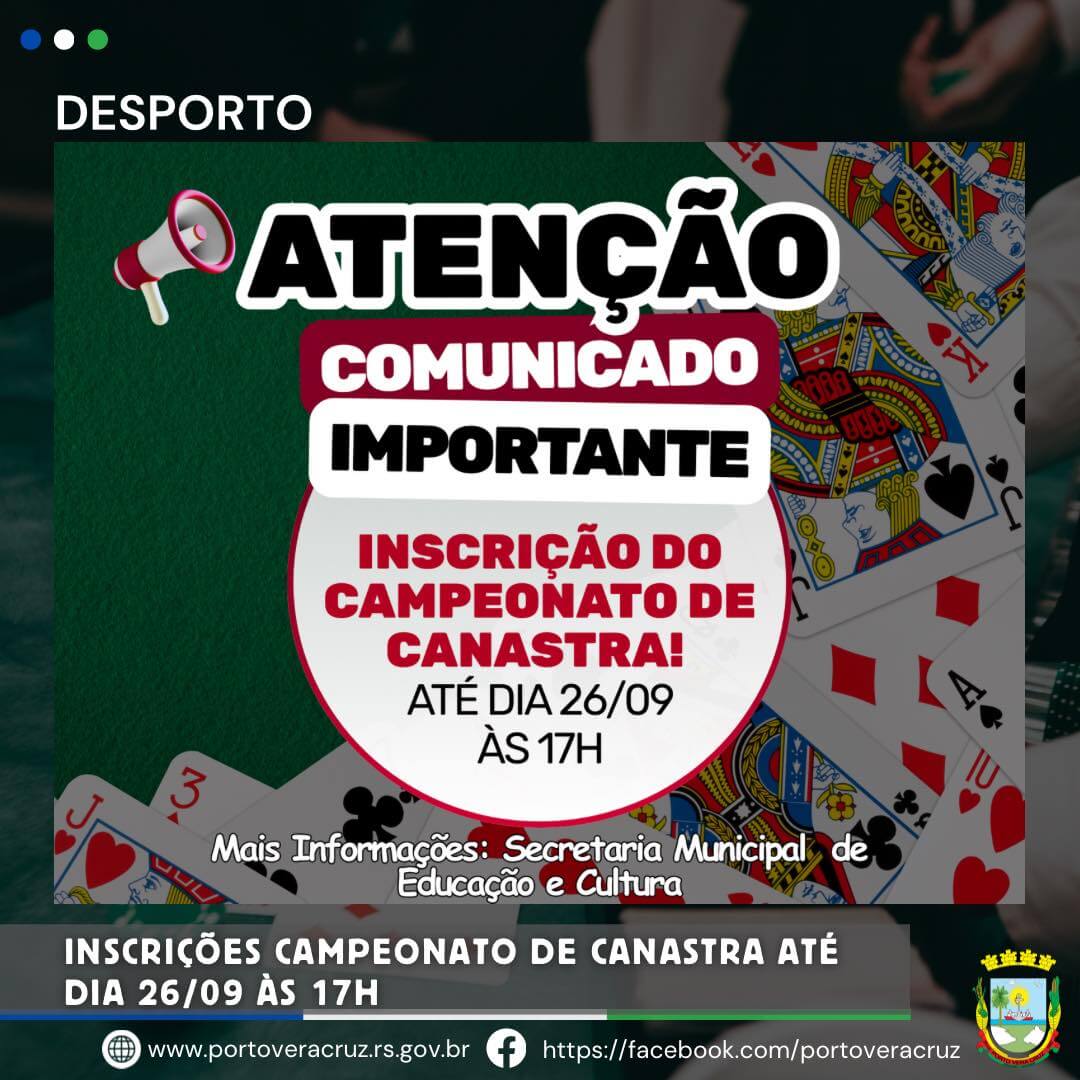 O Conselho Municipal de Desporto informa que o período de inscrições para o Campeonato Municipal de Canastra foi prorrogado até sexta-feira, dia 26 de setembro, às 17 horas.