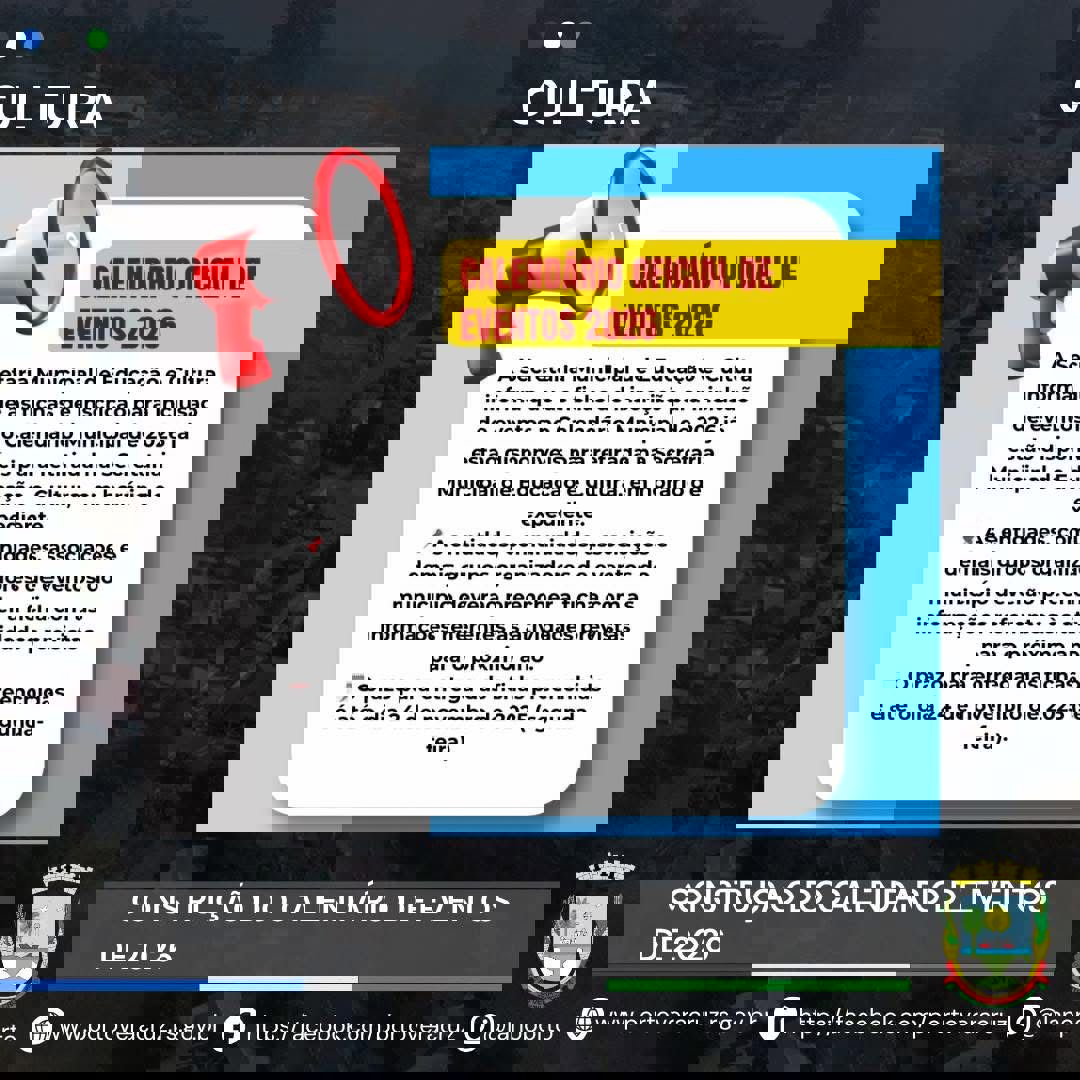 A Secretaria Municipal de Educação e Cultura informa que as fichas de inscrição para inclusão de eventos no Calendário Municipal de 2026 já estão disponíveis para retirada na Secretaria Municipal de Educação e Cultura, em horário de expediente.