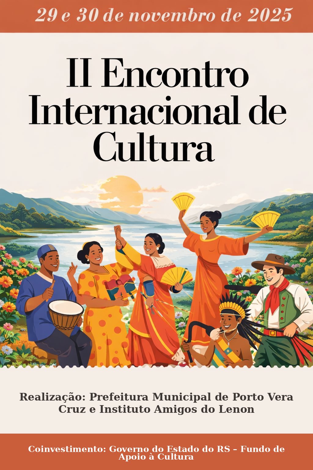 O Município de Porto Vera Cruz promove, nos dias 29 e 30 de novembro de 2025, o II Encontro Internacional de Cultura, evento que integra a programação cultural do município e reúne apresentações e expressões artísticas com foco na valorização da diversidade cultural e no fortalecimento dos vínculos comunitários.