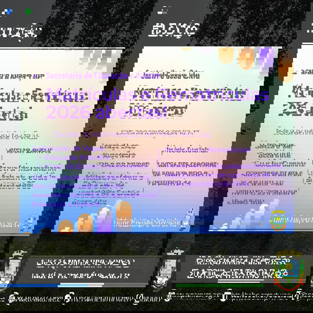 A Secretaria Municipal de Educação informa que está aberto o período de solicitação de vagas, matrículas e rematrículas para o ano letivo de 2026 nas escolas da Rede Municipal de Ensino de Porto Vera Cruz.