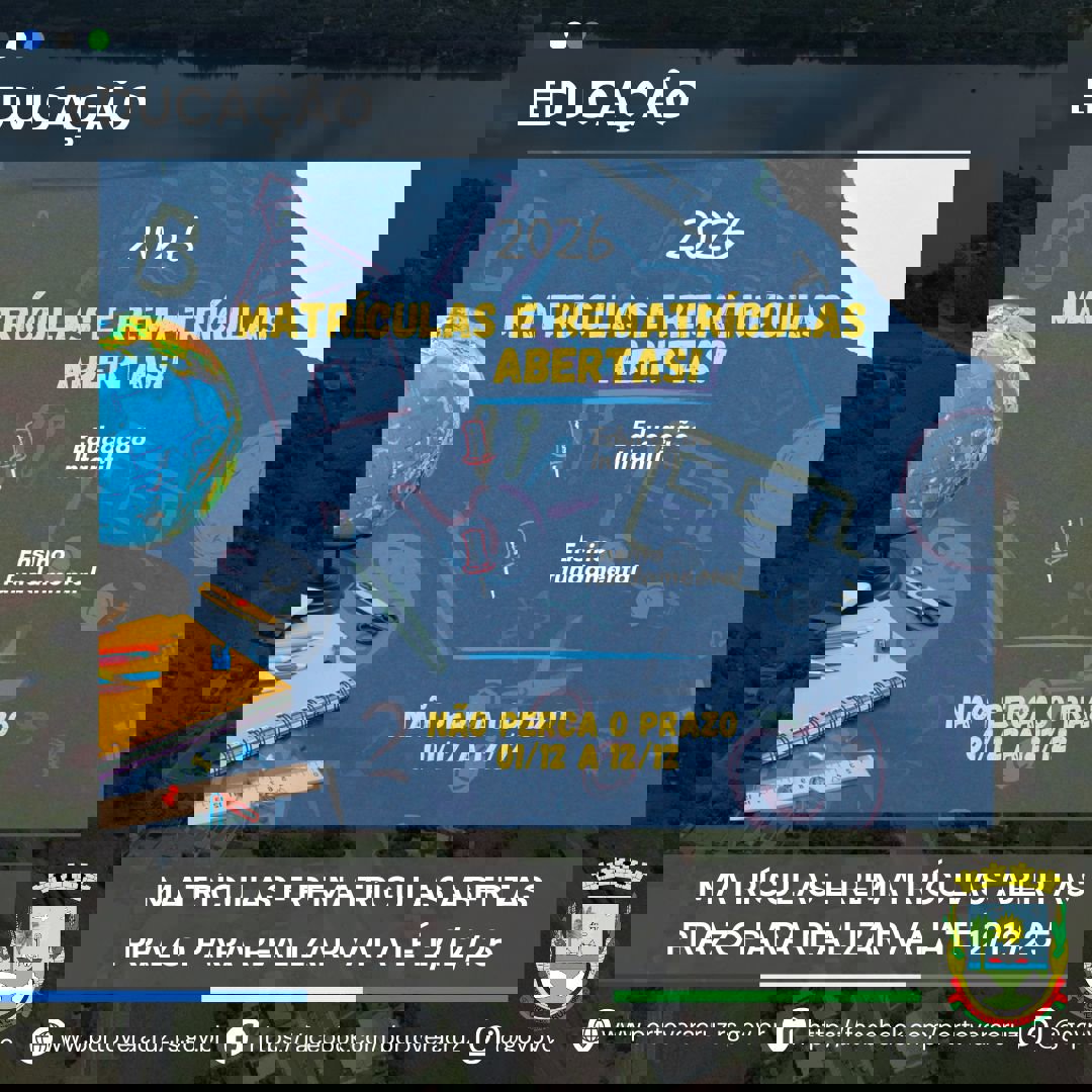 A Secretaria Municipal de Educação informa que o período de matrículas e rematrículas nas escolas da rede municipal de ensino de Porto Vera Cruz iniciou esta semana, e se estende até o dia 12 de dezembro de 2026.