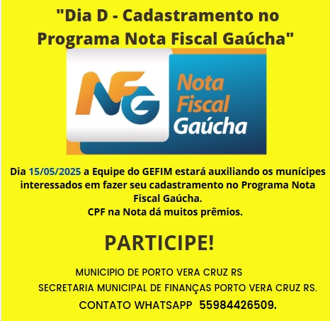 No dia 15/05/2025, será realizado o Dia “D”, para cadastramento dos Munícipes, os interessados poderão procurar a Equipe do GEFIM – Grupo de Educação Fiscal Municipal, na Prefeitura Municipal, para que auxiliem no processo.
