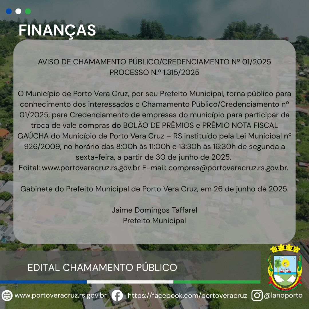 O Município de Porto Vera Cruz, por seu Prefeito Municipal, torna público para conhecimento dos interessados o Chamamento Público/Credenciamento nº 01/2025, para Credenciamento de empresas do município para participar da troca de vale compras do BOLÃO DE PRÊMIOS e PRÊMIO NOTA FISCAL GAÚCHA do Município de Porto Vera Cruz – RS instituído pela Lei Municipal nº 926/2009, no horário das 8:00h às 11:00h e 13:30h às 16:30h de segunda a sexta-feira, a partir de 30 de junho de 2025. Edital: www.portoveracruz.rs.gov.br E-mail: compras@portoveracruz.rs.gov.br.