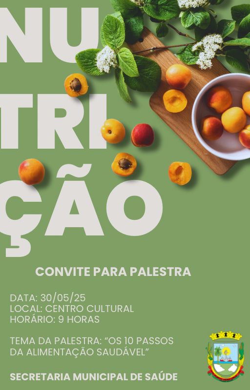 A Secretaria Municipal de Saúde convida a população para participar da palestra "Os 10 Passos da Alimentação Saudável", palestrante Luiza Cambri Dal-Ri.