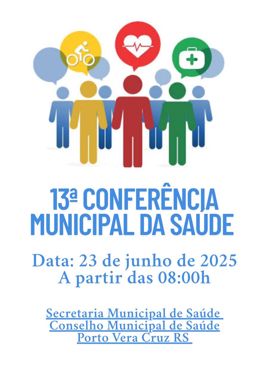 A Prefeitura convida toda a população para participar da 13ª Conferência Municipal de Saúde, que será realizada nesta semana. O evento é um importante espaço de diálogo entre a gestão municipal, profissionais da saúde, conselheiros e a comunidade.