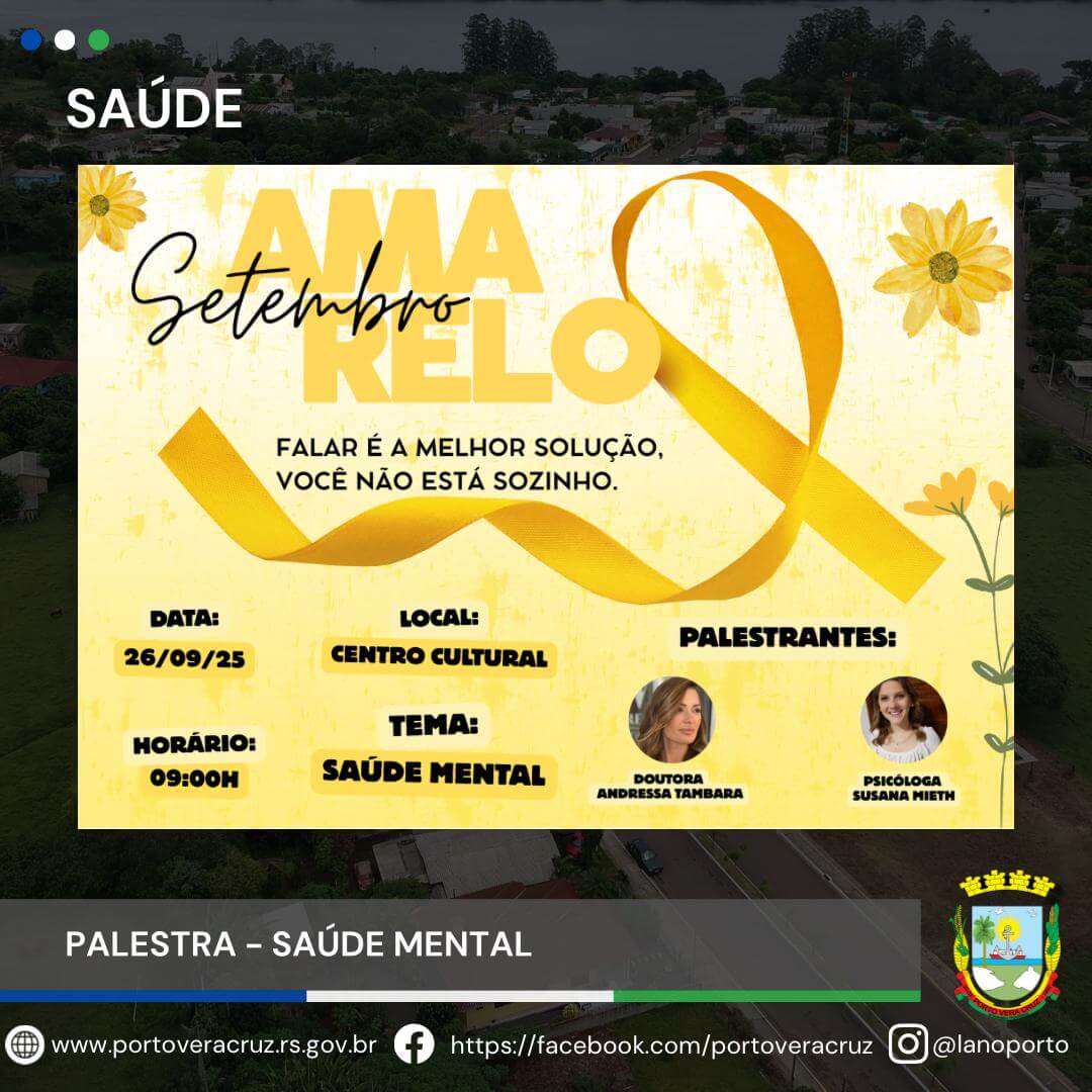 No dia 26 de setembro, a Secretaria Municipal de Saúde realizará uma palestra especial sobre saúde mental, ministrada pela Dra. Andressa Tambara e pela Psicóloga Susana Mieth.